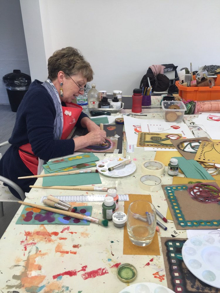 During the first session we distressed some items by applying two coats of waterbased paint and working with sand paper, we also make a go at crackle varnish. This time, participants, had brought in their own piece of furniture. They made a good start on it, first coat of paint, and soon no sound other than the sanding paper and the wet brush. From to painting to sanding to painting but also a great deal of sticking and painting/printing going on.