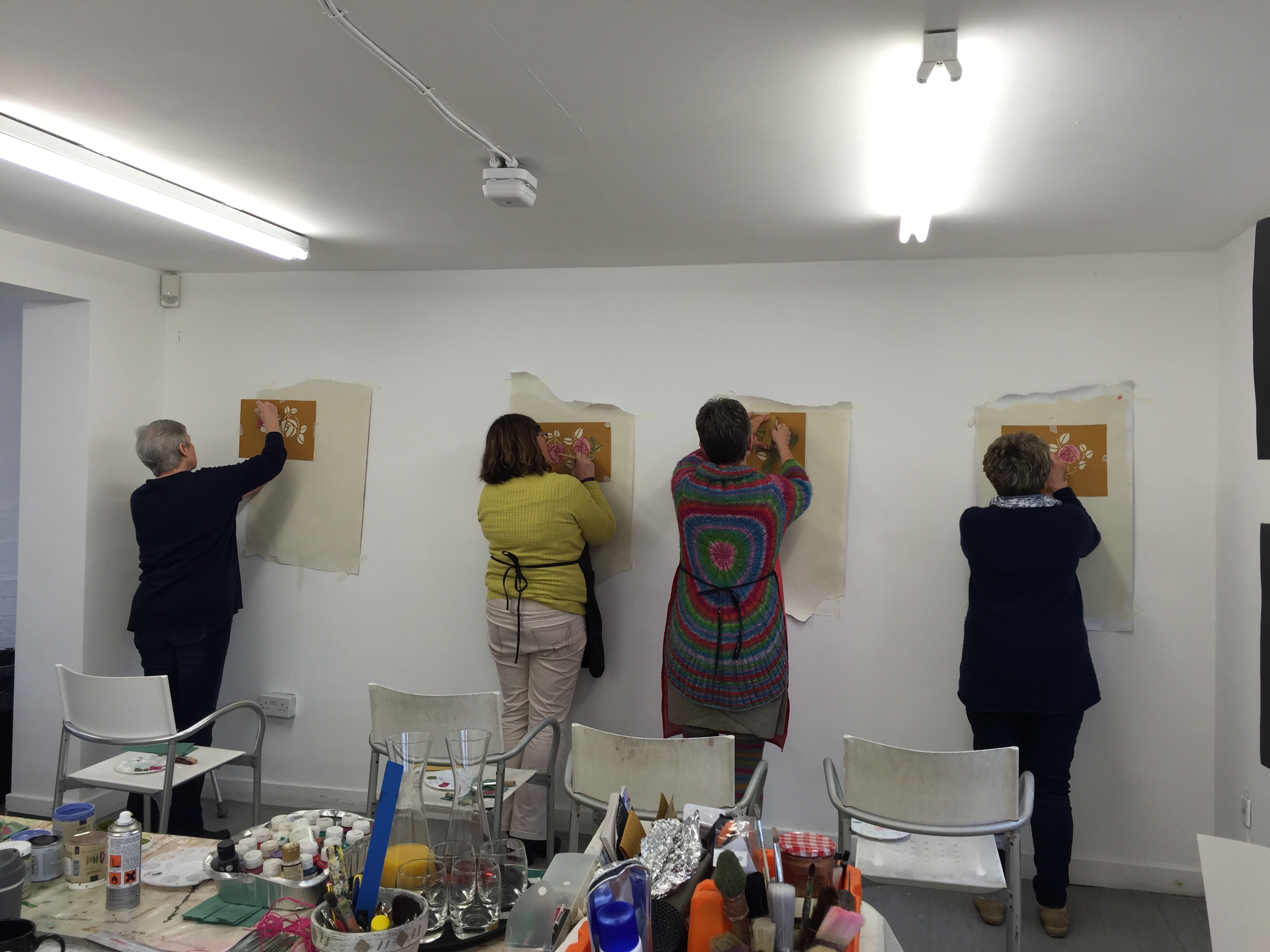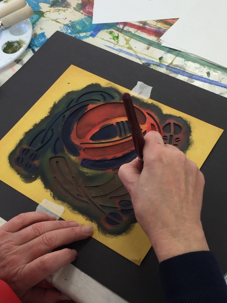 So a while ago we printed with a bit of embossed paper ! Just a snippet ! A sample I had once collected at a local B&Q … A free sample ! A piece of recycling and the result was AMAZING ! A delicate frieze of Art Nouveau style appeared on my board and I heard the gasp when lifting up my improvised stamp. With a bit of recycling I hope I have opened the mind of my 8 ladies to the potential of recycling for Upcycling but for sure they were on a complete high when they left !